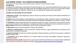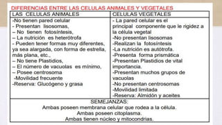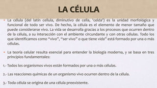 El documento describe las células como la unidad básica de la vida. Explica que la teoría celular se basa en que todos los organismos están formados por células, las reacciones químicas ocurren dentro de las células y toda célula proviene de otra preexistente. También resume los procesos de mitosis y meiosis, por los cuales las células se dividen para reproducirse o crear gametos con la mitad de cromosomas, respectivamente.
