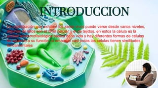 El documento describe las características de las células y tejidos vegetales. Explica que la célula vegetal tiene una pared celulósica que la envuelve y un protoplasto vivo con membrana plasmática, citoplasma y núcleo. Las células se unen por la lámina media y pueden tener pared primaria o secundaria. Los tejidos vegetales forman los órganos y se agrupan en sistemas de protección, fundamental y vascular.