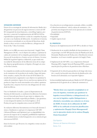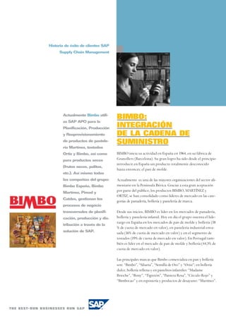 Bimbo implementó con éxito SAP APO para unificar y optimizar su cadena de suministro entre España y Portugal. Esto mejoró la integración entre las áreas de planificación, producción y distribución, redujo los stocks, mejoró la rentabilidad y el servicio al cliente al lograr una mayor frescura de los productos. Además, Bimbo planea expandir el uso de SAP APO a más de sus empresas y procesos logísticos.