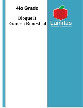 Este documento contiene un examen de Ciencias Naturales, Geografía, Historia y Formación Cívica y Ética para el 4to grado. Consta de 85 preguntas de opción múltiple sobre temas como la reproducción de plantas, ecosistemas, culturas mesoamericanas, derechos humanos y valores cívicos. El examen evalúa los conocimientos y competencias que los estudiantes deben haber adquirido en el segundo bimestre del año escolar.