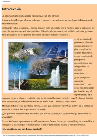 Este documento presenta una webquest sobre fuentes de energía renovables. La tarea consiste en que los estudiantes investiguen diferentes tipos de energías renovables y elaboren un informe. Luego se dividirán en grupos para defender una fuente de energía en particular mediante carteles, presentaciones u otros materiales. Finalmente habrá un debate para elegir la mejor opción energética para el futuro. El proceso incluye pasos como buscar información sobre energías, elaborar esquemas sobre planes energéticos y ahorro de energía, y organizar la defensa de una fu