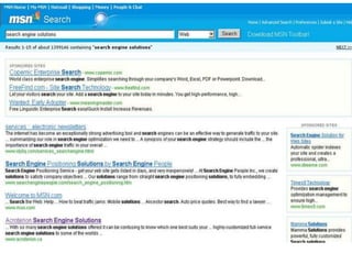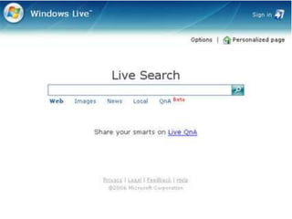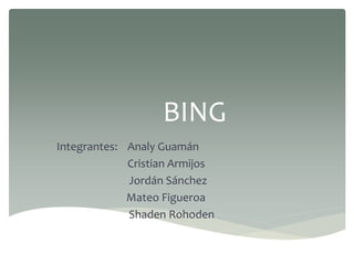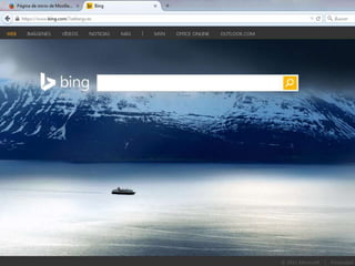 Bing es un buscador web creado por Microsoft. Fue presentado en 2009 para reemplazar a versiones anteriores como MSN Search, Windows Live Search y Live Search. Aunque Bing tiene entre un 12-18% del mercado, sigue generando pérdidas significativas debido a su baja cuota frente a Google, que domina el mercado con más del 60% de participación. Bing busca mejorar su rentabilidad a través de cambios en la interfaz como imágenes diarias y nuevas secciones de contenido.