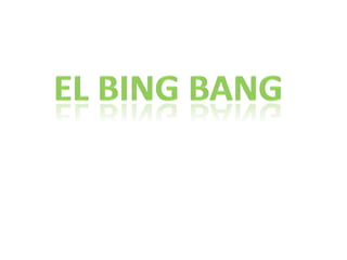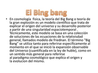 La teoría del Big Bang explica el origen y evolución del universo a partir de una singularidad inicial hace aproximadamente 13,800 millones de años, seguida de una expansión rápida. Técnicamente, este modelo se basa en soluciones a las ecuaciones de la relatividad general conocidas como el modelo de Friedmann. El término "Big Bang" se refiere tanto al inicio de la expansión observable del universo como al paradigma cosmológico general sobre su origen y evolución.