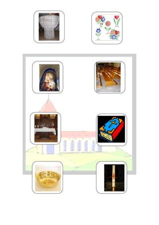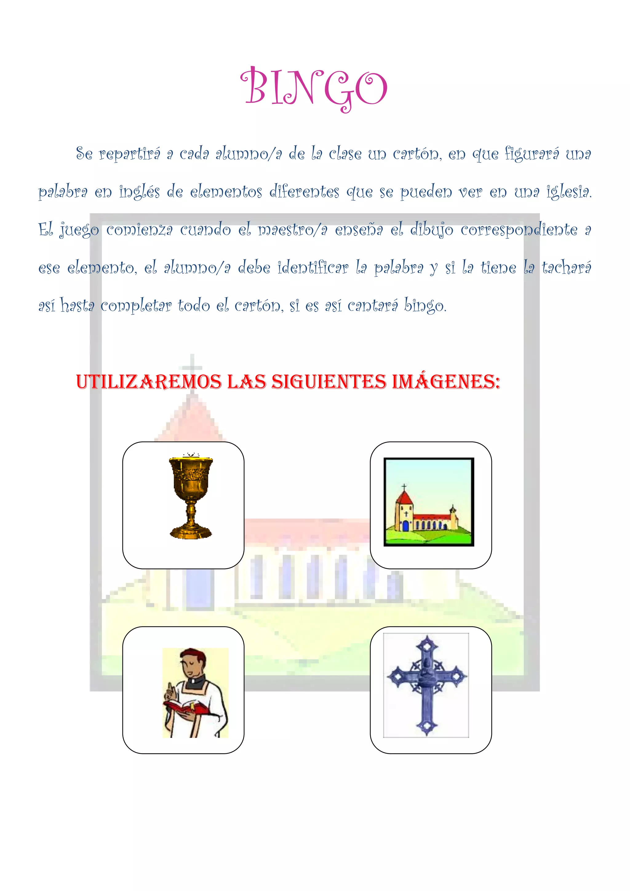 El documento describe un juego de bingo que se utilizará en clase para que los estudiantes practiquen palabras en inglés relacionadas con elementos que se pueden encontrar en una iglesia, como altares, cruces y confesionarios. Los estudiantes recibirán una tabla con las palabras y tendrán que tacharlas cuando el maestro muestre la imagen correspondiente. El primero en completar la tabla gritará "bingo".