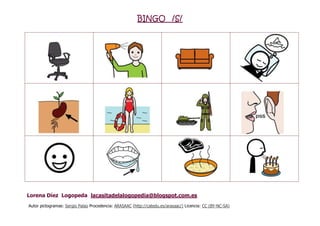 El documento presenta las instrucciones para jugar al juego Bingo, mencionando a la logopeda Lorena Díez como autora de los pictogramas utilizados y a Sergio Palao como creador de los mismos, los cuales provienen de ARASAAC y tienen licencia CC.