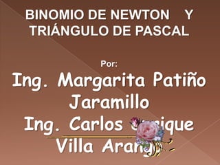 El documento explica la relación entre el binomio de Newton y el triángulo de Pascal. El triángulo de Pascal proporciona los coeficientes para el desarrollo del binomio de Newton, donde los coeficientes en cada fila corresponden a los términos del binomio elevado a esa potencia. El documento incluye ejemplos para ilustrar cómo usar los coeficientes del triángulo de Pascal para expandir binomios.
