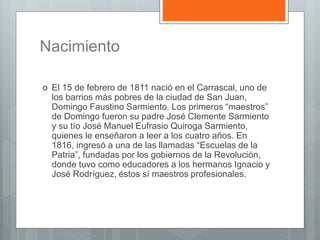 Domingo Faustino Sarmiento nació en 1811 en San Juan, Argentina. Recibió una educación básica y luego se opuso al dictador Juan Manuel de Rosas, exiliándose en Chile donde fundó escuelas y publicó su obra más importante, Facundo. Regresó a Argentina después de la caída de Rosas y se desempeñó como periodista, educador, gobernador y presidente, donde promovió la educación pública, obligatoria y gratuita. Falleció en 1888 en Paraguay.