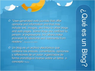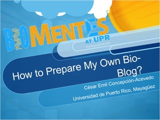 El documento proporciona información sobre cómo crear un bio-blog. Explica que un bio-blog debe incluir información personal como fotos, intereses y metas académicas. También debe contener entradas iniciales sobre los objetivos del semestre y el proyecto de investigación de la persona, así como enlaces relacionados. El documento ofrece consejos sobre cómo mantener un blog interesante y generar discusión entre lectores.