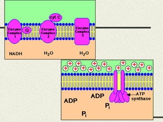 Las mitocondrias son orgánulos celulares donde se produce la mayor parte de la energía de la célula a través de la fosforilación oxidativa. Tienen dos membranas que dividen su interior en una matriz y un espacio intermembrana. Contienen su propio ADN y enzimas que llevan a cabo reacciones como la glucólisis, el ciclo de Krebs y la cadena transportadora de electrones para generar ATP a partir de moléculas como la glucosa y los ácidos grasos. Esto crea un gradiente de protones que la