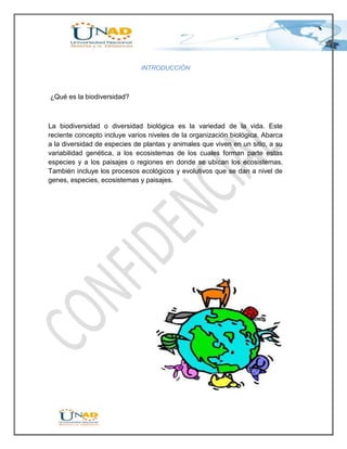 Este documento presenta un resumen de un curso sobre biodiversidad. Incluye secciones sobre la introducción a la biodiversidad, comentarios sobre cómo evitar la pérdida de biodiversidad en Colombia, las ventajas de estudiar la biodiversidad y una conclusión. El documento destaca la importancia de preservar los ecosistemas y la diversidad genética para mantener el equilibrio ecológico.