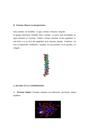 Este documento resume las diferentes clasificaciones y estructuras de las proteínas. Se clasifican las proteínas en globulares e insolubles fibrosas dependiendo de su forma, y en proteínas simples y conjugadas dependiendo de su composición. Las proteínas tienen cuatro niveles de estructura: primaria determinada por la secuencia de aminoácidos, secundaria definida por enlaces de hidrógeno, terciaria que es su configuración tridimensional final, y cuaternaria cuando dos o más péptidos se unen.