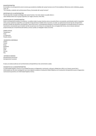 La antropometría es la ciencia que estudia las medidas del cuerpo humano para establecer diferencias entre individuos y grupos. Existe la antropometría estática, que mide el cuerpo en reposo, y la dinámica, que mide el cuerpo en movimiento. La antropometría permite describir el estado morfológico del cuerpo y ubicar a cada individuo dentro de un grupo mediante medidas como el peso, la estatura y las dimensiones de las diferentes partes del cuerpo.