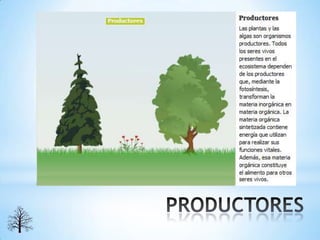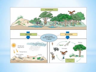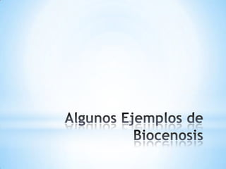 Este documento describe diferentes conceptos relacionados con las biocenosis y las redes tróficas. Explica que una biocenosis se refiere al conjunto de organismos que viven en un área y las interacciones entre ellos, y que dentro de cada biocenosis existe una especie dominante sobre la cual dependen las demás. También describe las diferentes relaciones como competencia, comensalismo y parasitismo que se establecen entre las especies, así como la estructura vertical y horizontal de las biocenosis. Por último, introduce el concepto de redes tróficas y cómo