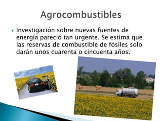 El documento discute los agrocombustibles y plantea varias preocupaciones sobre su impacto ambiental y social. Señala que aunque los agrocombustibles podrían reducir gases de efecto invernadero, a menudo se cultivan en tierras con alta biodiversidad y que sustentan a comunidades locales. También compiten con cultivos alimenticios y aumentan los precios de los alimentos. Algunos sostienen que futuros agrocombustibles serán más sostenibles, pero por ahora su producción a gran escala tiene consecuencias negativas.