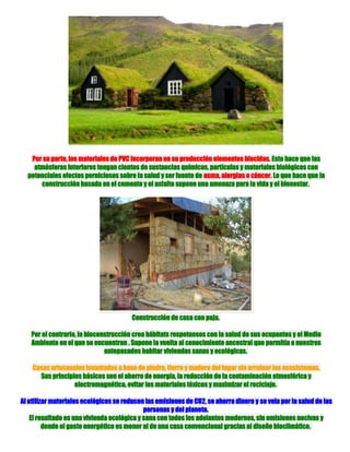 El documento describe los principios y materiales de la bioconstrucción, una forma de construcción sostenible y respetuosa con el medio ambiente y la salud humana. Utiliza materiales naturales como la tierra, la piedra, el barro y la madera de manera artesanal. Esto permite construir viviendas energéticamente eficientes que aprovechan recursos como el sol, el agua y el viento, y que son más baratas a largo plazo.