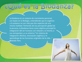 La biodanza es un sistema creado por Rolando Toro en 1960 para lograr la integración personal a través de ejercicios de danza, canto y movimiento guiados por música. La biodanza se practica en grupos y busca fortalecer las expresiones vitales del ser humano como la sexualidad, creatividad y afectividad. Ofrece beneficios como reducir el estrés, mejorar el estado de ánimo y autoestima, y estimular las interacciones positivas.