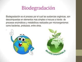 La biodegradación es el proceso por el cual las sustancias orgánicas son descompuestas por microorganismos como bacterias en elementos más simples e inocuos. La velocidad de biodegradación depende de factores como la estabilidad molecular de la sustancia, el medio, la presencia de oxígeno y enzimas. Los productos biodegradables incluyen plantas, materia animal y otros residuos orgánicos, pero algunos productos como bolsas de plástico y vidrio pueden tardar cientos o miles de años en biodegradarse.