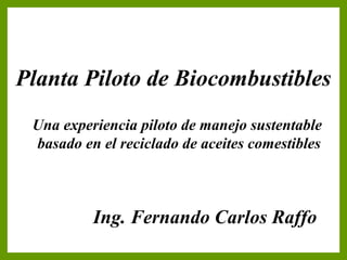 El documento describe un programa piloto de producción de biocombustible llamado Biocolón en la ciudad de Colón, Argentina. El programa recicla aceite vegetal usado de restaurantes locales para producir biodiesel, con el objetivo de capacitar estudiantes y proteger el medio ambiente. Explica el proceso de recolección del aceite, producción de biodiesel, y campañas de concientización comunitaria.