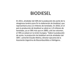 En 2011, aproximadamente el 30% de la producción de aceite de oleaginosas en Argentina, unas 2,5 millones de toneladas, se destinará a la elaboración de biodiésel. En 2010, la producción de biodiésel en el país fue de 1,9 millones de toneladas, un 58% más que en 2009, y el 70% de ese volumen se exportó a la Unión Europea.