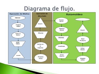 Este documento describe el proceso de fabricación de tanques de almacenamiento de gas hechos de polietileno a través de rotomoldeo. Explica las etapas de molienda de pellets, mezcla con aditivos, y rotomoldeo para dar forma al producto final, el cual se enfría y almacena. También incluye detalles sobre los tiempos de cada operación y la producción diaria y semanal posible con la maquinaria disponible.
