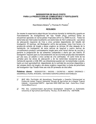 El documento describe la instalación y operación de un biodigestor de bajo costo para producir biogás y fertilizante a partir de excretas animales. Explica los materiales necesarios, como 32 metros de tubo de polietileno y accesorios de PVC, que cuestan alrededor de $200. Detalla el proceso de construcción, incluyendo la excavación de una fosa aislada térmicamente y la colocación del tubo, produciéndose biogás estable después de 30 días. Un biodigestor típico puede abastec