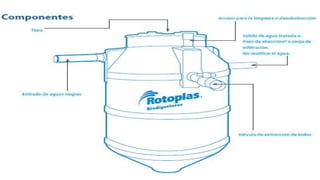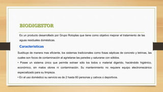 El documento describe un biodigestor desarrollado por Grupo Rotoplas para tratar aguas residuales domésticas de manera más eficiente que sistemas tradicionales como fosas sépticas. El biodigestor extrae sólidos de forma higiénica y económica sin malos olores ni contaminación, requiriendo poco mantenimiento. Es adecuado para el uso doméstico de 2 a 60 personas.