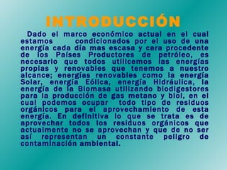 El documento propone implementar biodigestores para aprovechar desechos orgánicos y producir biogás y bioabono de manera sostenible. Los biodigestores convertirían los desechos en energía renovable mediante un proceso anaeróbico, y el bioabono resultante se podría usar para agricultura orgánica. El proyecto ayudaría a mitigar el cambio climático y reducir la contaminación, a la vez que proporcionaría alternativas de energía y fertilizantes de bajo costo.