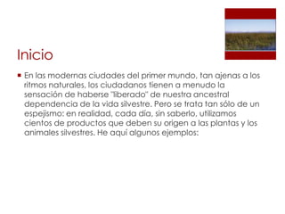 Este documento explica por qué es importante mantener la biodiversidad. La biodiversidad sostiene el funcionamiento de los ecosistemas que proporcionan servicios vitales para el bienestar humano como alimentos, agua y aire limpio. La pérdida de biodiversidad amenaza estos servicios ecosistémicos y por lo tanto nuestra supervivencia. Además, la biodiversidad tiene valor científico, ecológico, estético y económico. Debemos conservarla para aprovechar sus beneficios aún desconocidos y