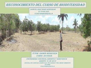 Este documento presenta un resumen del curso de Biodiversidad de Samuel Díaz Barcasnegras en la Universidad Nacional Abierta y a Distancia. Colombia tiene una gran biodiversidad con el 10% de las especies del mundo a pesar de solo tener el 0.7% de la superficie terrestre. La conservación y recuperación de la biodiversidad es importante para preservar los recursos naturales para las generaciones futuras.