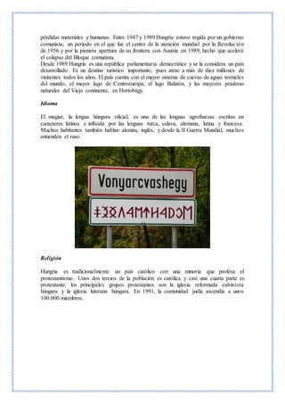 Hungría es un país de Europa Central ubicado en la llanura panónica. Tiene una rica historia y cultura y actualmente es miembro de la Unión Europea. El país tiene una biodiversidad notable, con bosques, praderas y el lago Balatón, el mayor lago de Europa Central. La agricultura es una parte importante de la economía húngara debido a sus fértiles suelos.