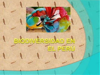 El documento describe la gran biodiversidad del Perú. El Perú es uno de los 10 países más biodiversos del mundo, con una gran variedad de ecosistemas, especies y diversidad genética. Alberga más de 25,000 especies de plantas y animales, y es líder mundial en diversidad de papas, camotes, quinua y otros cultivos nativos. La biodiversidad peruana incluye 84 zonas de vida, 1815 especies de aves y es importante protegerla para el futuro.