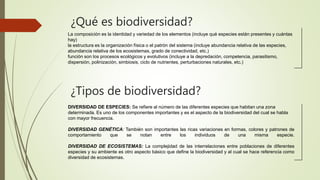 Este documento trata sobre la biodiversidad y define sus componentes principales: composición, estructura y función. Explica los diferentes tipos de biodiversidad, incluyendo diversidad de especies, genética y de ecosistemas. También cubre temas como la vida silvestre, su conservación y las técnicas usadas para ello. Por último, analiza el concepto de extinción de especies, dando ejemplos de especies extintas y en peligro, así como las causas directas e indirectas que llevan a la extinción.
