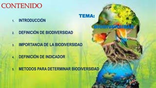 El documento habla sobre la biodiversidad en México. Define la biodiversidad como la variedad de vida en los organismos y ecosistemas, incluyendo la diversidad genética, de especies y de ecosistemas. Explica la importancia de la biodiversidad para el bienestar humano y los ecosistemas. Describe métodos para medir la biodiversidad como el número de especies, abundancia relativa, y distribución equitativa de especies.