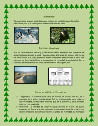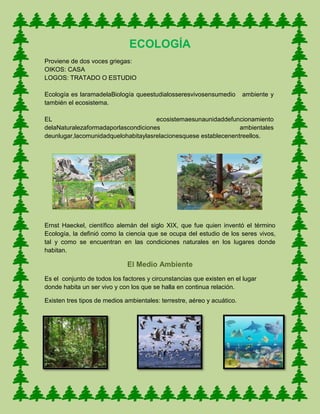 El documento resume conceptos clave de ecología, incluyendo que la ecología estudia los seres vivos y su interacción con el medio ambiente, define ecosistemas como unidades formadas por comunidades biológicas y sus factores ambientales, y describe las relaciones entre organismos como depredación, competencia, mutualismo y parasitismo.