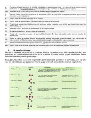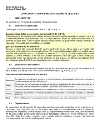 Este documento resume los principales bioelementos y oligoelementos necesarios para la vida. Los bioelementos primarios como el carbono, hidrógeno, oxígeno, nitrógeno, fósforo y azufre constituyen el 96% de la materia viva. Los bioelementos secundarios como el magnesio, calcio, sodio, potasio y cloro se encuentran en una proporción de hasta el 3,3% de la materia viva. Los oligoelementos como el hierro, manganeso, cobre y zinc están presentes en cantidades muy pequeñas