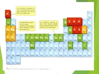 El documento clasifica los bioelementos en tres grupos: bioelementos primarios que constituyen el 99% de la materia viva como el carbono, hidrógeno, oxígeno, nitrógeno, fósforo y azufre; bioelementos secundarios como el sodio, potasio, calcio y cloro que se encuentran en menor cantidad; y oligoelementos como el hierro y yodo que se encuentran en cantidades insignificantes. Los bioelementos se encuentran en los alimentos y cumplen funciones esenciales en los seres vivos.