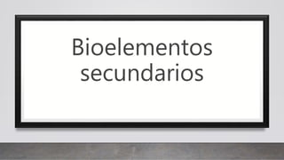 Este documento describe los bioelementos secundarios que forman parte esencial de los seres vivos aunque representan menos del 2.5% de su masa total. Los bioelementos secundarios son sodio, calcio, potasio, magnesio y cloro. Cada uno juega un papel importante en procesos fisiológicos como la transmisión del impulso nervioso y la contracción muscular.