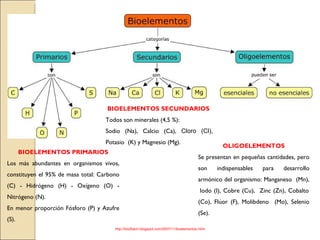 El documento describe los principales bioelementos y biomoléculas que constituyen los organismos vivos. Explica que el carbono, el hidrógeno, el oxígeno y el nitrógeno son los bioelementos primarios más abundantes, mientras que el fósforo, azufre, sodio, calcio, cloro y potasio son secundarios. También señala la presencia de oligoelementos como el manganeso, yodo y cobalto. Luego, detalla las propiedades y funciones del agua, sales minerales, carbohidratos