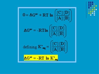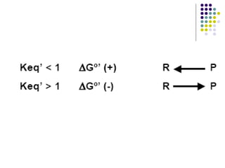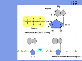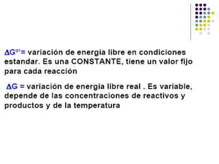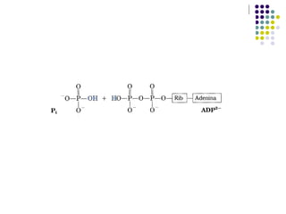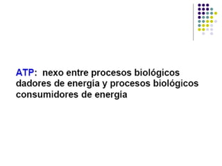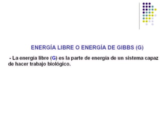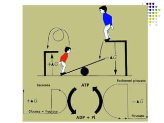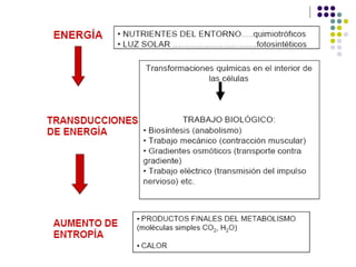 Este documento trata sobre bioenergética y cómo los seres vivos intercambian y transforman energía. Explica que la energía no se crea ni destruye, solo se transforma. Describe cómo las células utilizan reacciones acopladas para generar ATP a partir de la degradación de alimentos, permitiendo que ocurran reacciones que normalmente no serían espontáneas. Finalmente, resume que la fosforilación oxidativa y la fosforilación a nivel de sustrato son los mecanismos clave mediante los cuales las cél