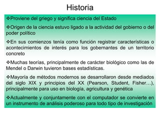 Este documento introduce la bioestadística, su historia y ramas. La bioestadística proviene del griego y se desarrolló inicialmente para registrar características de interés para gobernantes. Muchas teorías biológicas como las de Mendel y Darwin tuvieron bases estadísticas. Actualmente, la bioestadística se usa ampliamente junto con computadoras para todo tipo de investigación. Algunas ramas de la estadística son descriptiva, probabilidad e inferencia. La estadística se aplica en