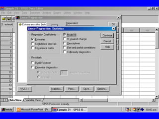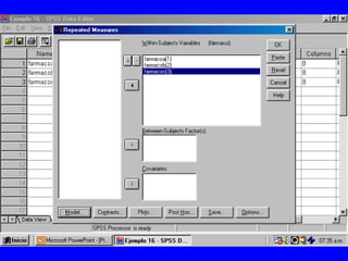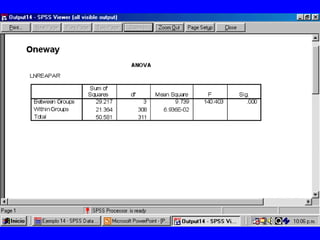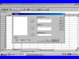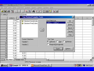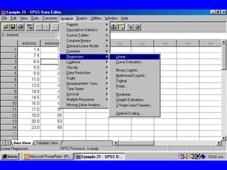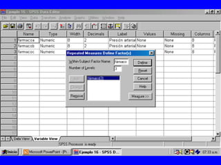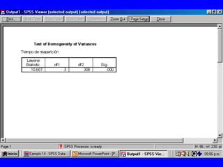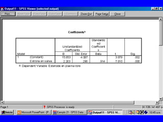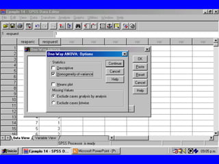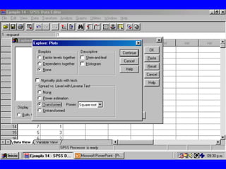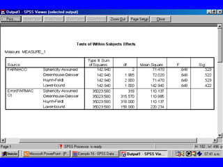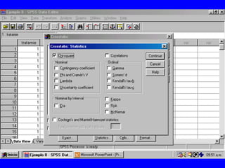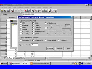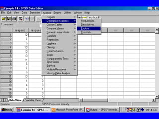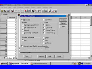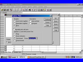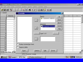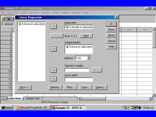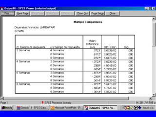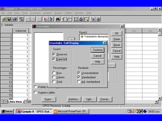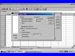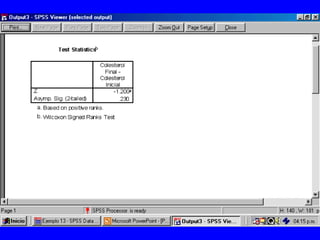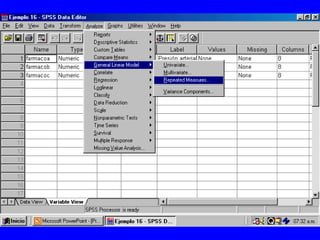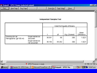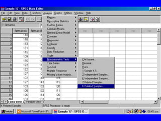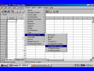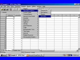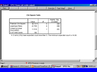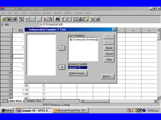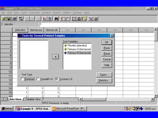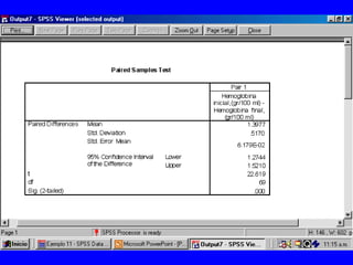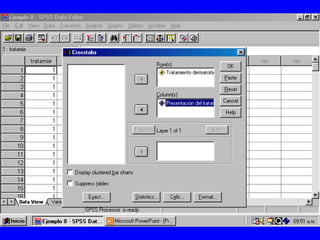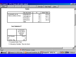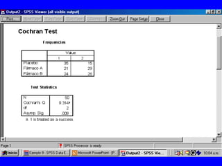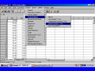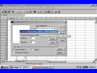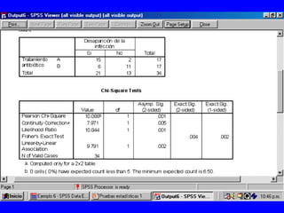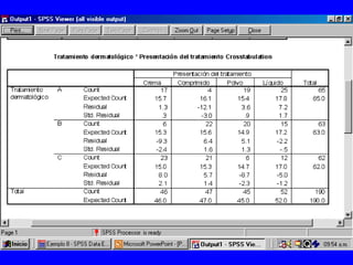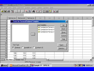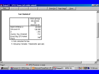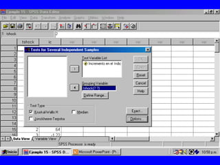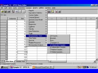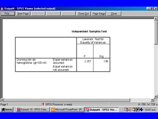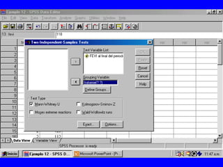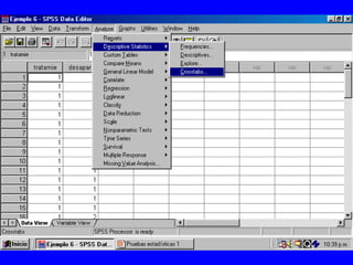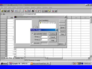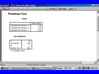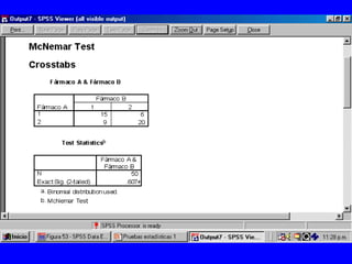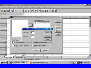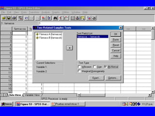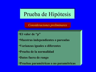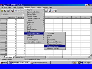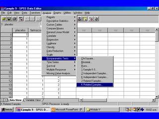 El documento trata sobre conceptos básicos de bioestadística para la realización y análisis de pruebas de hipótesis. Explica el significado del valor de p y cómo interpretarlo, la diferencia entre muestras independientes y pareadas, la importancia de probar la normalidad de los datos antes de seleccionar pruebas paramétricas o no paramétricas, y ejemplos de cómo utilizar pruebas estadísticas como la t de Student, U de Mann-Whitney y Chi cuadrado en SPSS para comparar grupos con variables cual