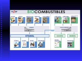 Este documento describe el bioetanol, un biocombustible líquido producido a través de la fermentación y destilación de materias primas ricas en azúcares como la caña de azúcar, el maíz y la pataca. Explica que el bioetanol puede usarse como combustible o aditivo para motores de gasolina y que la pataca tiene un alto potencial como materia prima debido a su rendimiento y bajo impacto en la cadena alimentaria. Finalmente, resume que el Centro de Investigación Agraria La Orden-Valde