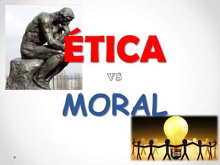 El documento discute la diferencia entre la ética y la moral. Define la moral como un conjunto de costumbres que se convierten en normas para regular una sociedad, las cuales varían a través del tiempo y el espacio. La ética, por otro lado, se refiere a la reflexión filosófica sobre los actos humanos, que son autónomos, libres y conscientes. Mientras la moral puede imponerse de forma externa, la ética promueve el libre albedrío y la capacidad de cuestionar las normas para formar una opinión propia.