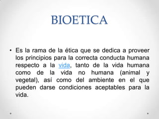 Este documento presenta una introducción a la bioética. Define la bioética como la rama de la ética que se dedica a los principios de la conducta humana con respecto a la vida. Explica los cuatro principios fundamentales de la bioética: autonomía, beneficencia, no maleficencia y justicia. También cubre los diferentes ámbitos de la bioética como la bioética teórica, clínica e influencia social y política.