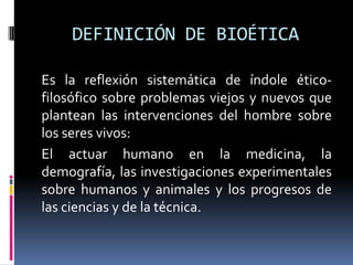 El documento presenta una definición de bioética y describe sus principios fundamentales como la beneficencia, la no maleficencia, la justicia y la autonomía. Explica cada principio y también menciona regulaciones y documentos éticos importantes como la Declaración de Helsinki, el Código de Núremberg y el Informe Belmont.