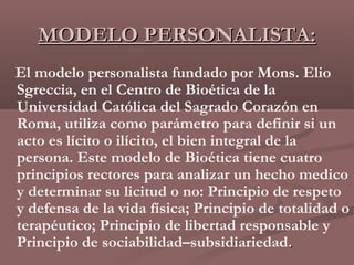 Este documento describe el modelo personalista de bioética. Este modelo utiliza cuatro principios para analizar situaciones médicas y determinar su licitud: 1) respeto y defensa de la vida desde la concepción hasta la muerte natural, 2) principio terapéutico de buscar el bien del paciente, 3) libertad responsable subordinada al valor de la vida, y 4) principio de solidaridad. Según este modelo, actos como el aborto, la eutanasia y la experimentación con embriones son considerados ilícitos.
