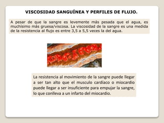 La viscosidad de la sangre es 3,5 a 5,5 veces mayor que la del agua, lo que aumenta la resistencia al flujo sanguíneo. El flujo laminar es ordenado mientras que el turbulento es caótico. La ecuación de continuidad expresa la conservación del caudal de un fluido a través de un tubo. La presión arterial sistólica y diastólica junto con la frecuencia cardíaca determinan el volumen minuto cardiaco y gasto cardíaco. Los corazones artificiales sirven para reemplazar parcial o totalmente un cor