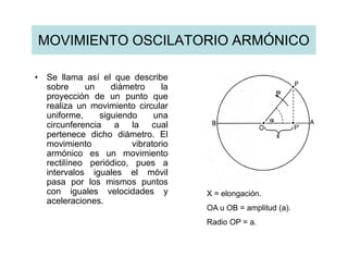 El documento describe el movimiento oscilatorio armónico y su aplicación a la audición. Explica que el movimiento oscilatorio armónico es un movimiento periódico en el que el punto móvil pasa por los mismos puntos a intervalos iguales. Luego describe cómo este movimiento se aplica al sonido, el cual se propaga a través de ondas longitudinales que crean zonas alternas de compresión y depresión a medida que viajan. Finalmente, explica brevemente cómo este movimiento oscilatorio se transmite a través de la cadena de huesecillos en