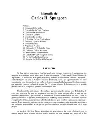 Este documento es una biografía de Carlos H. Spurgeon, un famoso predicador británico del siglo XIX. Nació en 1834 en una pequeña aldea rural inglesa. A pesar de venir de un humilde origen, se convirtió en un poderoso orador y fundó una iglesia masiva en Londres. Tuvo un gran impacto a través de su predicación y también escribió muchos libros. Fue considerado el "Príncipe de los predicadores" y tuvo una influencia cristiana muy extendida a través de su ministerio.