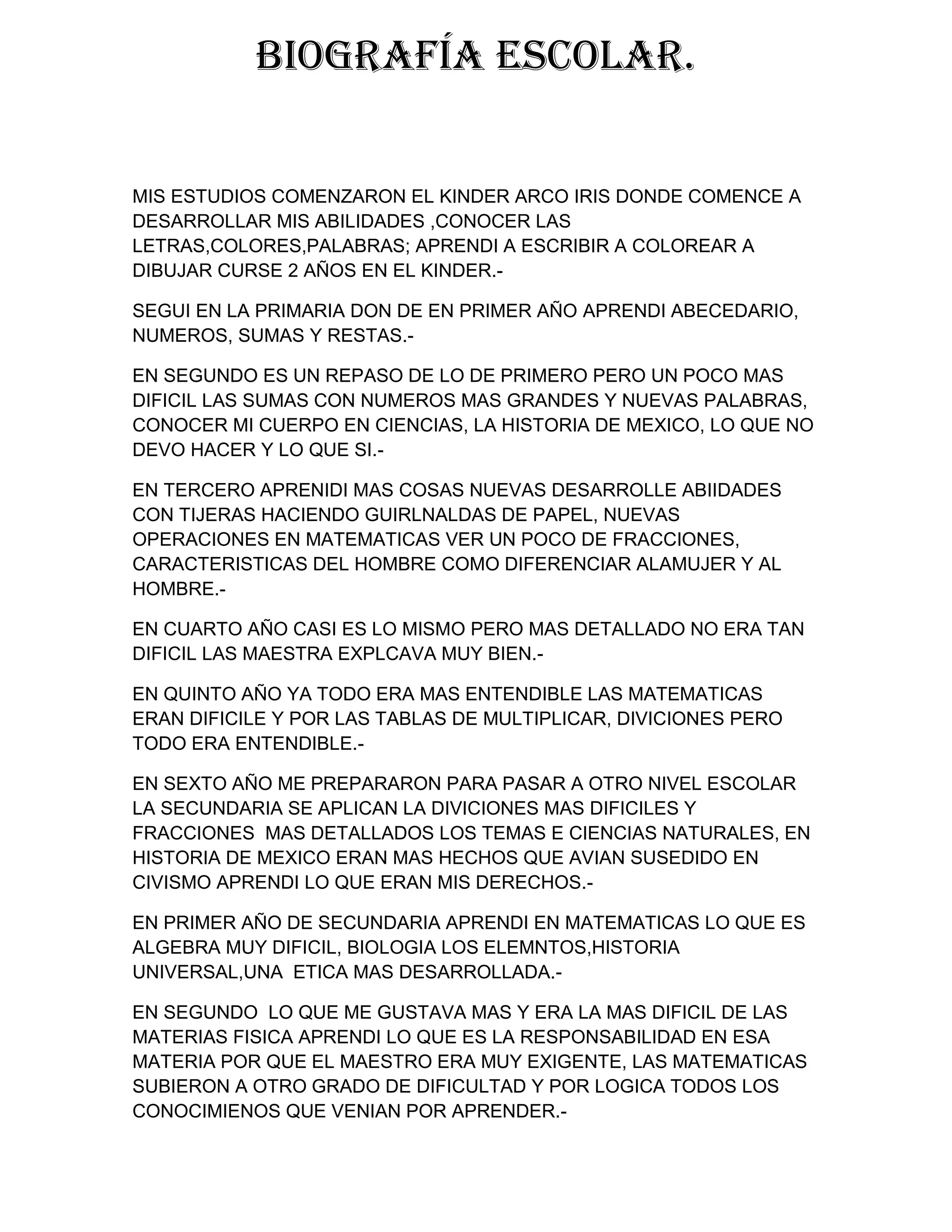 Este documento resume la trayectoria educativa del autor desde el jardín de niños hasta el segundo semestre del bachillerato. Comenzó en el jardín de niños donde aprendió letras, colores y habilidades básicas. Continuó su educación primaria donde aprendió sobre abecedario, números, sumas y restas. Más adelante en la secundaria se enfocó en asignaturas como álgebra, biología e historia. Actualmente cursa el segundo semestre en el bachillerato con nuevas materias como física.